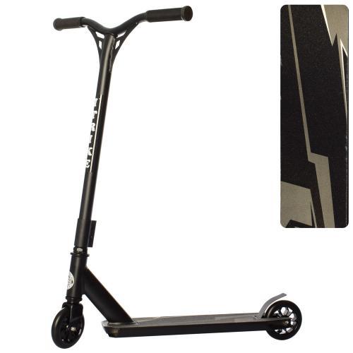 алюм+сталь,трюковый, колеса 2штПУ110мм-алюм, руль83см, ширина руля49см, подножка32-10,5см, черный, в кор-ке